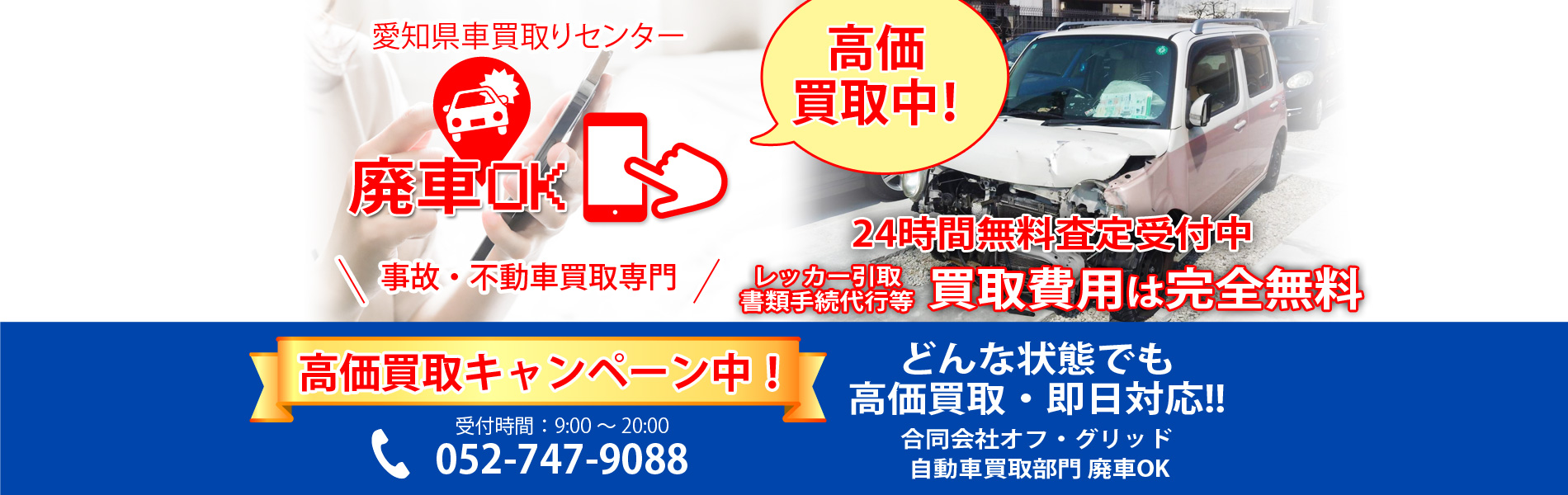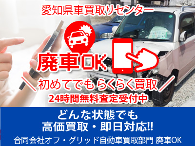 愛知県車買取センター 廃車OKは、どんなお車でも無料でお引取りいたします。積載車自社完備、自動車リサイクル法 引取業登録業者なので安心・確実、購入からから20年・30年と年式の古い車、車検が切れたまま放置している車、エンジンがかからない故障や不動車、事故車、走行距離が20万・30万キロの過走行車など、どんな廃車でも手数料は無料!完全無料引取りを保証しております。お気軽にご相談ください。